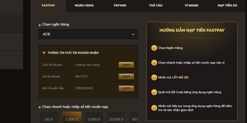 Để nạp tiền thành công, đầu tiên bạn truy cập phần “Nạp tiền” trên giao diện Oxbet sau khi đăng nhập. Chọn phương thức phù hợp, nhập số tiền mong muốn (thường có mức tối thiểu thấp) và làm theo hướng dẫn cụ thể của từng kênh. Ví dụ, với chuyển khoản ngân hàng, bạn copy thông tin tài khoản Oxbet và thực hiện chuyển từ app ngân hàng của mình.