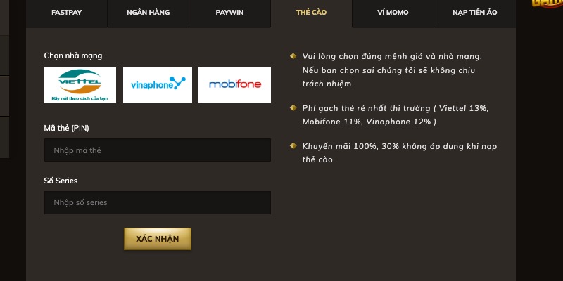 Oxbet cung cấp nhiều lựa chọn nạp tiền linh hoạt, phù hợp với nhu cầu của từng người chơi. Bạn có thể sử dụng ngân hàng trực tuyến như Vietcombank, BIDV, Techcombank để chuyển khoản nhanh chóng mà không mất phí. Các ví điện tử phổ biến như Momo, Viettel Money cũng được hỗ trợ, mang lại sự tiện lợi khi giao dịch mọi lúc mọi nơi. Ngoài ra, thẻ cào điện thoại và tiền mã hóa USDT là lựa chọn lý tưởng cho những ai muốn ẩn danh hơn.